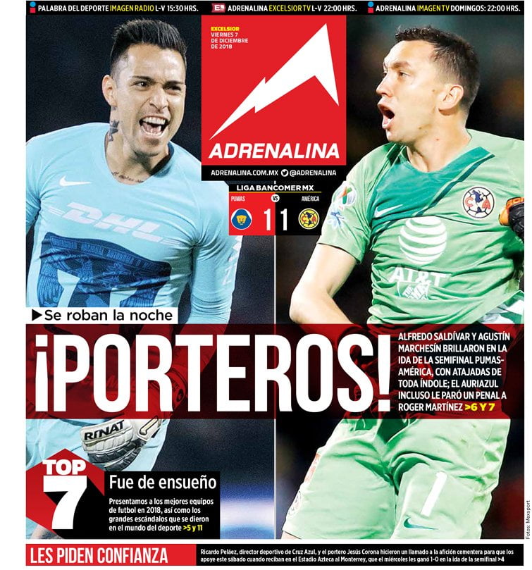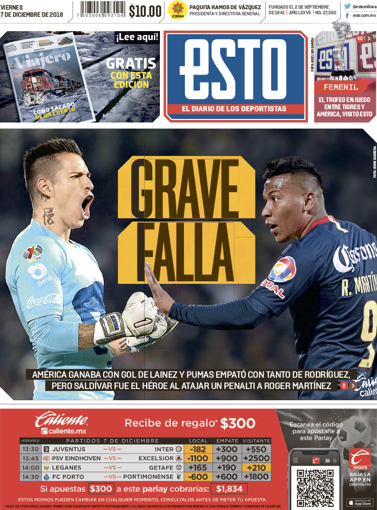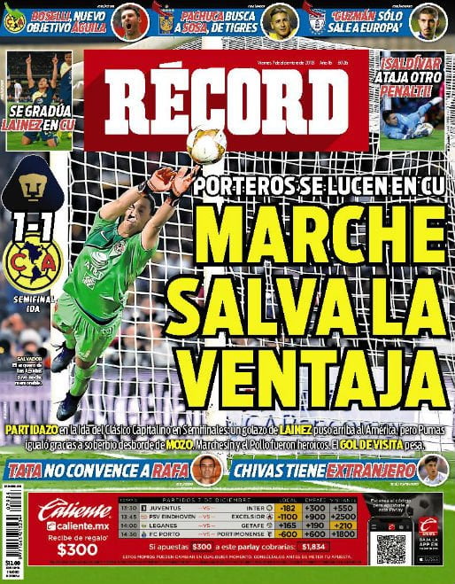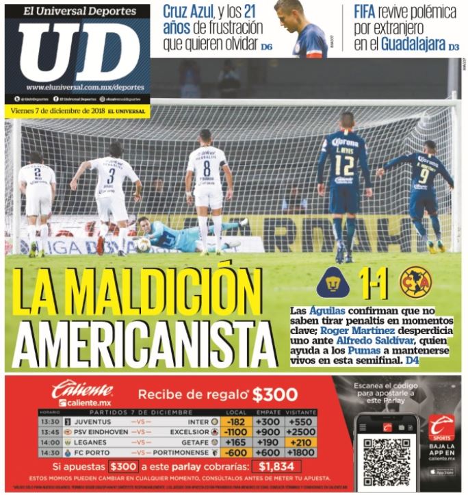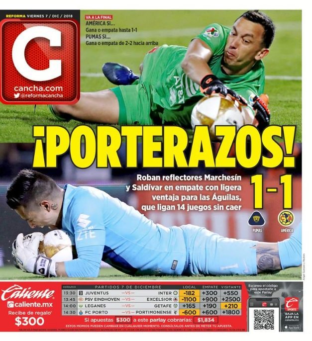 Portadas: Pumas 1-1 América – 07/12/18Publicación de la entrada:diciembre 7, 2018Categoría de la entrada:Portadas Compártelo: Comparte en Facebook (Se abre en una ventana nueva) Facebook Compartir en X (Se abre en una ventana nueva) X Compartir en Reddit (Se abre en una ventana nueva) Reddit Compartir en Telegram (Se abre en una ventana nueva) Telegram Compartir en WhatsApp (Se abre en una ventana nueva) WhatsApp Más Enviar un enlace a un amigo por correo electrónico (Se abre en una ventana nueva) Correo electrónico Haz clic en Pinterest (Se abre en una ventana nueva) Pinterest Compartir en Threads (Se abre en una ventana nueva) Threads Compartir en Mastodon (Se abre en una ventana nueva) Mastodon Me gusta esto:Me gusta Cargando... Etiquetas: Portadas de periódicos También podría gustarte Las portadas del día dedicadas a la victoria del América ante San Luismayo 11, 2023 Portadas de periódicos: América 2-0 Toluca – Cuartos de finalnoviembre 28, 2024 Portadas de periódicos: América 3-2 Barcelonadiciembre 22, 2023Leer más artículos Entrada anteriorPortadas: América 4-1 Veracruz – 25/11/18 Siguiente entradaPortadas: América 0-0 Cruz Azul – Final – 14/12/18